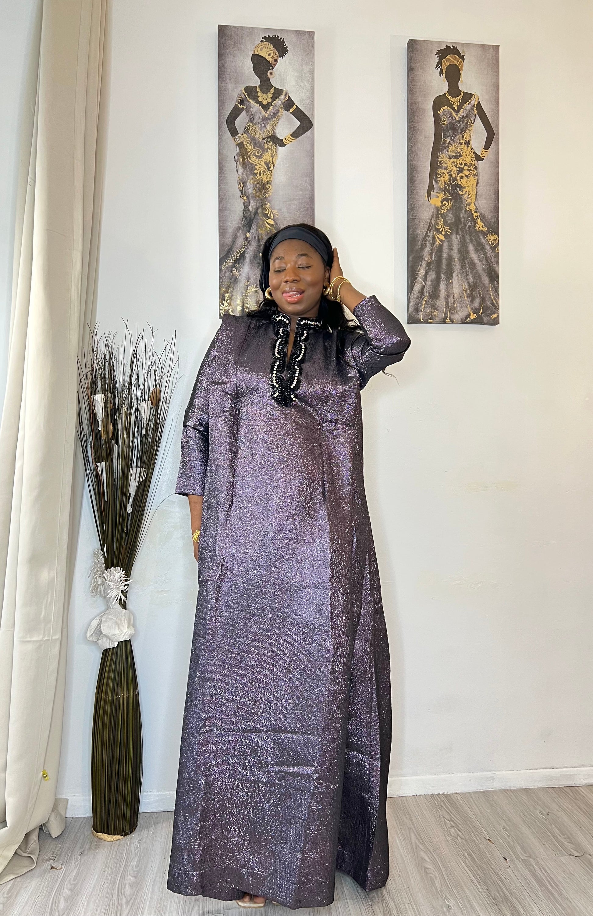 The dress is crafted from high-quality brocade and features beautiful beaded detailing around the neck, adding a touch of elegance and sophistication. This one-size dress features an inner belt for a perfect fit. Ready to ship, the photo shows exactly what you will receive.